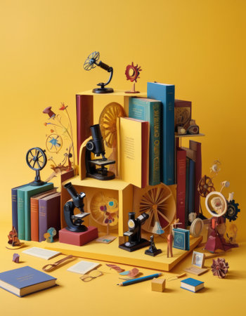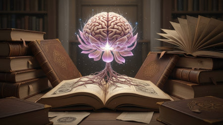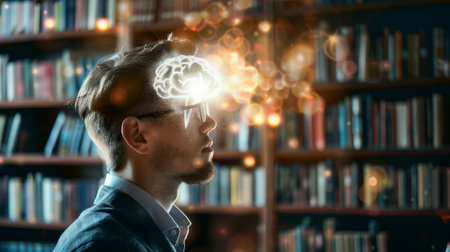 An artistic representation features a brain emerging from a book, suggesting knowledge and growth. Soft, warm lighting illuminates the scene, highlighting the textures of the books and the intricate details. The composition may be suitable for illustrations about education, learning, or ideas, ideal for various editorial uses.