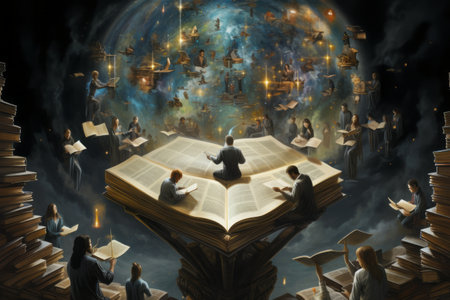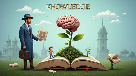 This conceptual illustration presents a vibrant scene depicting the growth of knowledge. It showcases a human brain sprouting from a book with surrounding elements like people, nature, and architectural structures. The style is illustrative, with bright colors and creative composition, suitable for educational or promotional contexts.
