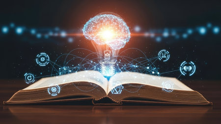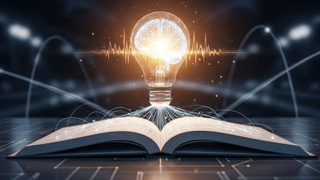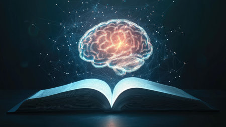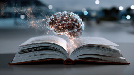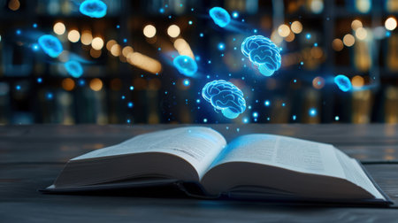 This captivating image features an open book with luminous brain icons floating above, representing the fusion of knowledge and technology, evoking inspiration for learning.