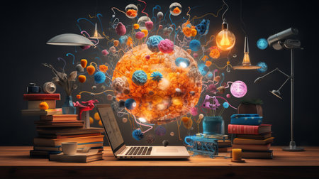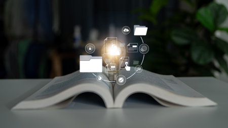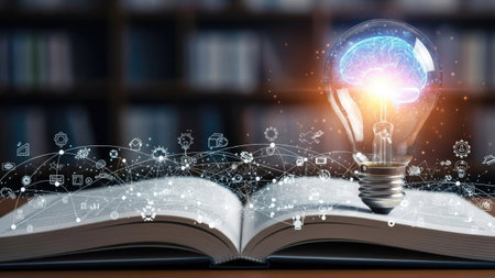 An open book showcases a glowing light bulb with digital icons, symbolizing the fusion of knowledge and technology in a contemporary learning environment. Tessel