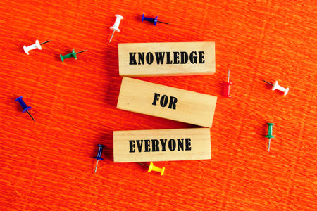 Learning for Everyone concept. Words KNOWLEDGE FOR EVERYONE assembled from wooden blocks in a composition with stationery pins on an orange provocative background, top view.