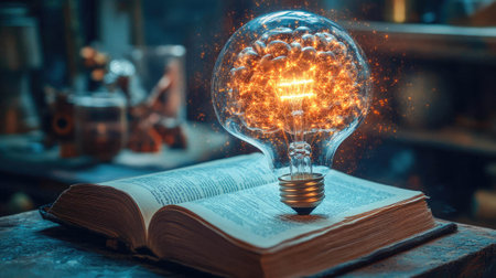 Glowing light bulb shaped like a brain over an open book, symbolizing knowledge, creativity, and innovation. Perfect for educational, learning, or inspirational concepts.