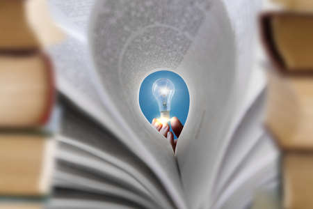 The concept of textbooks as a source of ideas. Hand holding a hot light bulb in front of a textbook.
