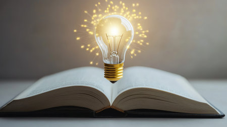 An open book with two light bulbs on the pages. The book is filled with equations and diagrams, giving the impression of a scientific or mathematical text. Scene is one of curiosity and exploration