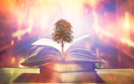 education concept with tree of knowledge planting on opening old big book in library with textbook, stack piles of text archive and aisle of bookshelves in school study class room
