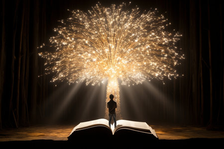 A person is holding a book with a light bulb inside of it. The light bulb is glowing and the book is open. Concept of curiosity and wonder