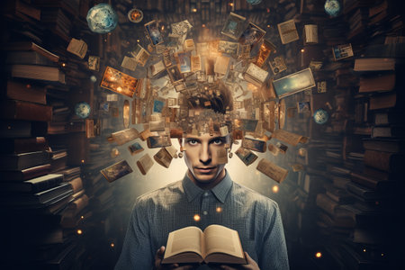 An artistic representation of an open book with a glowing brain above it, symbolizing creativity and knowledge. The background is blurred to emphasize the idea of imagination and learning.