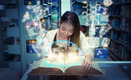Glowing lightbulb with virtual brain on open book and connection line for reading and education make smart or creative thinking idea concept.