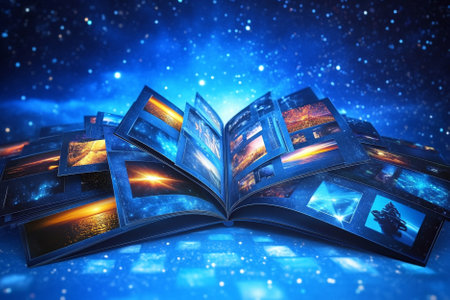 Vibrant digital media thumbnails create depth and movement in a multimedia library concept