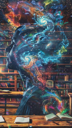 A captivating piece of conceptual art showing the annual collective mind. The explosion of the mind unveils a vibrant inner world, symbolizing boundless creativity, ideas, and the