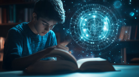 Teenage boy studying with an illuminated book while magical symbols float above in a cozy library setting at night
