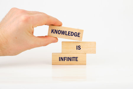 knowledge and education concept. KNOWLEDGE IS INFINITE on wooden blocks on a bright background.