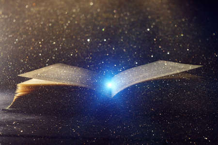 Book. Opened magic book with magic light. Abstract magic book on wooden background.