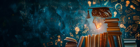 A person surrounded by books, with various symbols of education and learning, such as a graduation cap and a lightbulb. Generative AI