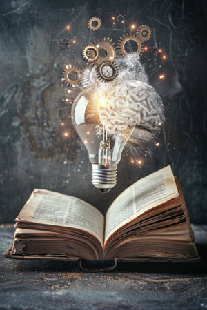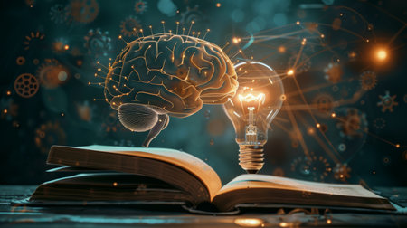 An artistic representation of an open book with a glowing brain hovering above it, symbolizing the fusion of knowledge and technology in modern learning.