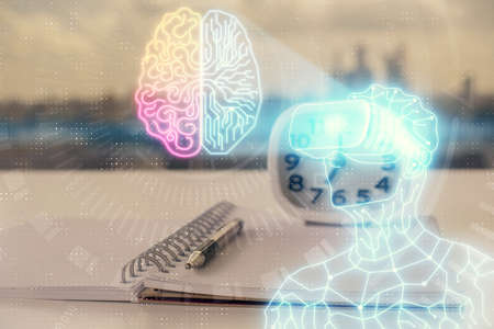 Double exposure of man in VR glasses drawing and desk with open notebook background. Concept of AR