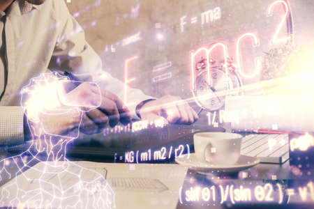 Desktop computer background and formula hologram writing. Double exposure. Education concept.