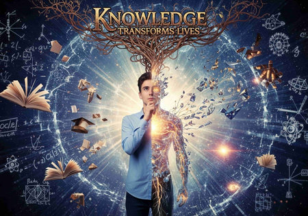 Rows of books in a digital library with the text Knowledge is power glowing.