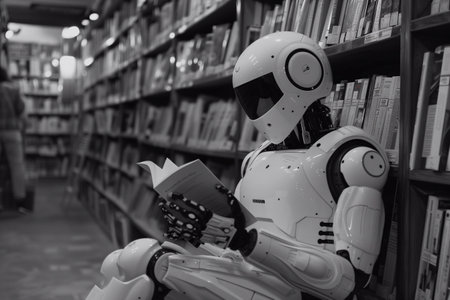 A robot is reading a book in the library.