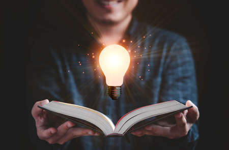 Reader open book with floating glowing light bulb for reading education , knowledge and creative think idea concept.