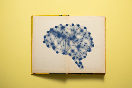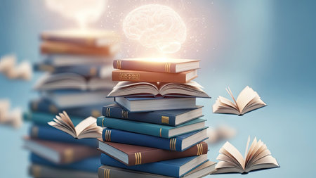 An imaginative depiction of a brain floating above an open book, symbolizing the connection between knowledge and cognitive learning in a digital age.