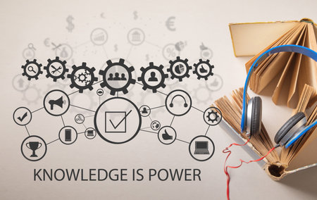 Training, courses, leveling up, gaining knowledge of the concept. A hand with an electric plug connects the word of KNOWLEDGE to the book. minimalistic humorous art collage