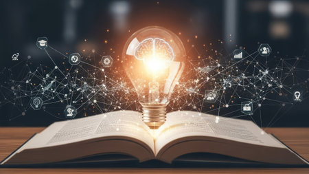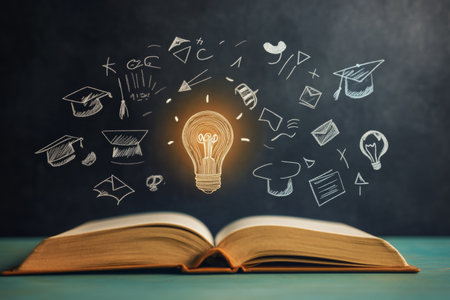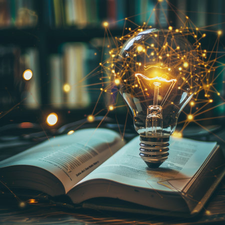 A light bulb glowing above an open book, representing innovative ideas in education, set against a dark, abstract background