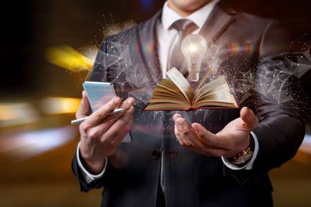 Light teaching concept. Shows his hand the book and burning light bulb.