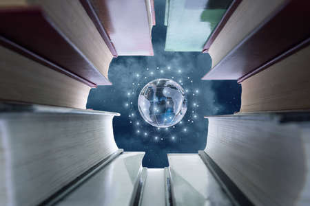 A captivating composition showcasing an open book with a holographic globe hovering above, symbolizing the fusion of education and technology in a modern learning environment.