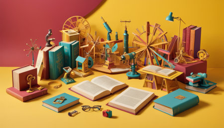 A vibrant conceptual image of a brain atop a stack of books, surrounded by icons of learning and creativity on a teal background AI generation