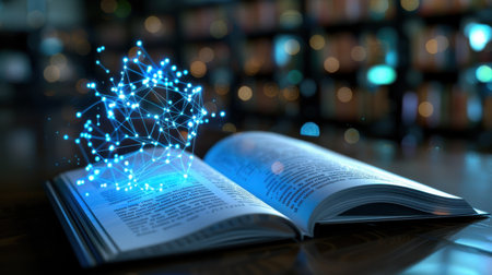 An open book emits glowing data connections, symbolizing the fusion of traditional education and modern technology. A perfect visual for themes in knowledge and innovation.