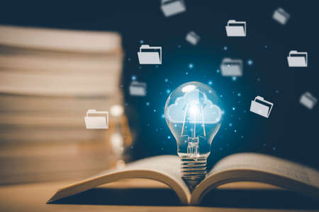 light bulb with cloud and document management system,innovation technology, business icons on network connection, Use technology cloud system, Digital marketing,knowledge, and searching for new ideas.