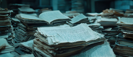 Old newspapers with yellowed pages stacked on a table in a vintage setting
