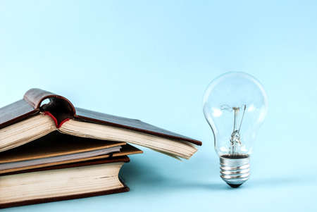Books and light bulb on blue background close up