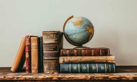 Stack of books on a wooden desk with a pastel ivory background, with a small globe, travel, study