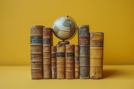 Old books and globe on yellow background. Education and knowledge concept.