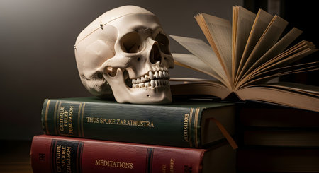 A dramatic still life featuring a human skull model resting on a stack of old, hardbound books. The book titles 'Thus Spoke Zarathustra' and 'Meditations' are visible, suggesting themes of philosophy, mortality, and knowledge. An open book is blurred in the background under moody lighting.