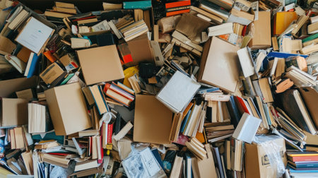 A chaotic display of assorted books and stacked boxes, showcasing a disorganized environment filled with reading materials and creative potential.