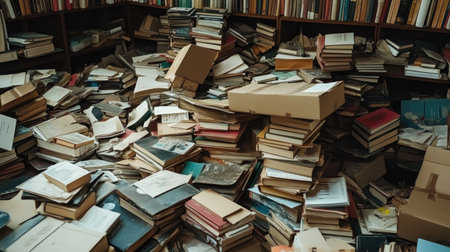A chaotic scene of books in disarray fills an indoor space, showcasing a mix of vintage and contemporary literature in various states of organization.