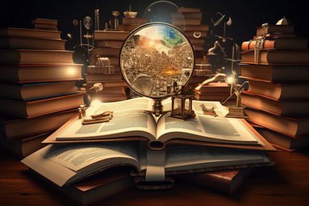 stack book with magnifying glass on wooden desk in information library of school or university, concept for education,reading , study, copy space and banner background.