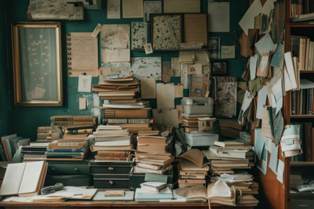 A student's desk brims with organized chaos, filled with scattered books and notes. Despite the clutter, a sense of order prevails, reflecting a busy, dedicated study space
