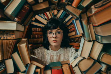 Creative portrait of a woman with glasses encircled by a plethora of books
