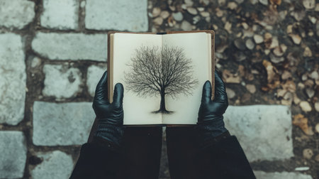 Open sketchbook with a tree illustration held by two gloved hands on stone background