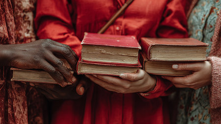Hands of african american women in red dresses holding books