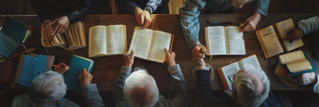 Top down view of prayer reading at bible book and sitting in circle with bible book on laps. Aerial view of diverse people looking at book while studying with faith, trust and hope, calm. Symposium.