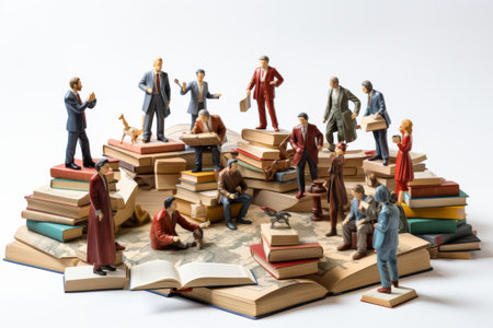 Miniature people toy figure photography. A men and girl couple stand reading on a opened book. Image photo