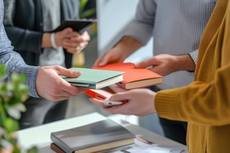 Three people are holding books and a cell phone. The books are of different colors and sizes. The people are standing close to each other, and they seem to be sharing the books