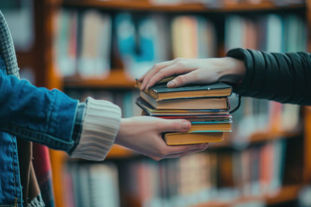 Hands holding stack of books in front of library bookshelf, concept of education and reading