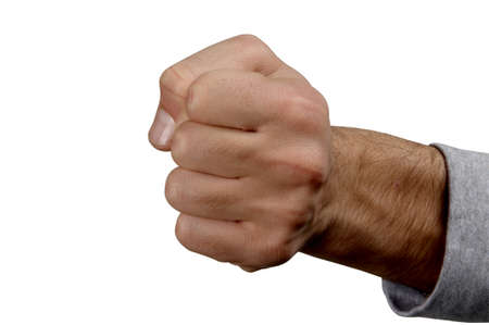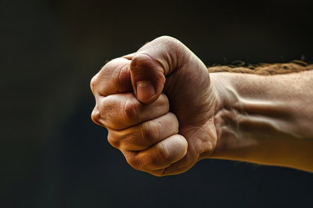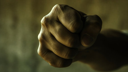 A strong, determined hand forms a tight fist, conveying power, readiness, and resolve. The knuckles are prominent, suggesting strength and potential impact.