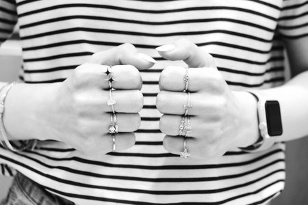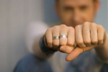 Detail of man's hand's wearing silver rings